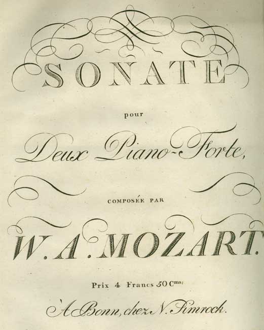 Mozart, Wolfgang Amadeus (1756-1791) - Collection complète de toutes le Oeuvres de Musique pour le Piano-Forte composées par Wolfgang Amedée Mozart Cahier XXIV contenant une sonate pour 2 piano-forte en ré majeur et une fugue en ut mineur - 200 CHFfr.s A Bonn, chez N.Simrock. A Paris, chez H: Simrock, professeur, marchand de musique et d'instrumens, rue du mont-blanc N°373 chaussée d'Antin, au coin de celle basse du rempart. 24 pages. La partition n'est pas datée( dans tous les cas, entre 1803-1805)Le cahier XXIV comprend une sonate pour 2 piano-forte en ré majeur et une fugue en ut mineur.( partition pour le primo piano-forte) Ces deux oeuvres correspondent à la sonate en ré majeur Kv448/375a et à la fugue en ut mineur Kv 426 de 1783. Ce cahier est dans les mêmes conditions que le cahier VII. Il a 24 pages. Cette partition est en très bon état, compte tenu de son âge. C'est une des premières éditions de ces oeuvres. Gravé sur acier, imprimé sur papier à la forme (fabrication artisanale feuille par feuille).